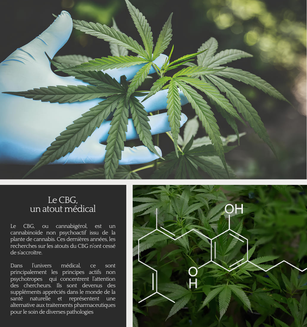 Le CBG est une molécule active naturellement présente dans la plante du chanvre. Lorsqu'il est couplé au CBD, les propriétés des cannabinoïdes sont renforcées. Ensemble ils permettent l'amélioration de l'aspect de la peau (réduction des rides), le traitement d'inflammations cutanées comme l’eczéma et le psoriasis, la réduction des inflammations intestinales et une meilleure relaxation psychique.